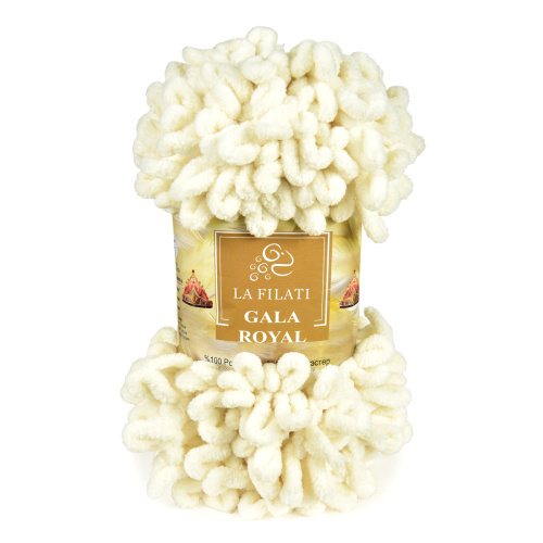 Эта фантазийная пряжа для ручного вязания невероятно мягкая, объемная и очень приятная на ощупь. Плюшевая ниточка изготовлена в виде готовых петелек. Вязать из нее легко и быстро без спиц и крючков. Готовые петли продеваются одна в другую в определённом порядке. В итоге получаются разнообразные узоры: плетёнка, колосок, зефирка, жемчуг, соты и ещё множество других узоров. Из La Filati GALA ROYAL создаются уютные пледы, очаровательные коврики-игрушки, мягкие подушечки и халаты, а также балаклавы, шапки, шарфы и другие теплые, лёгкие, неповторимые изделия.